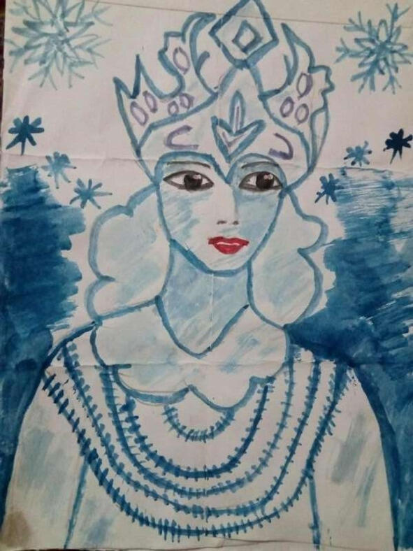 И тут увидел в стороне Снегурочку, всю сверкаюшую на солнце в переливающейся одежде. Удивлённо посмотрел на нее: ничего красивее он прежде не видел: такую красивую, что ни в сказке сказать, ни пером описать. Она так засмущалась, что ее румяные щечки зарделись, как яблоки на снегу. Их глаза встретились. Он посмотрел туда, где только что сидел и его передернуло. Он снова взглянул на незнакомку и уже не отводил взгляд от
