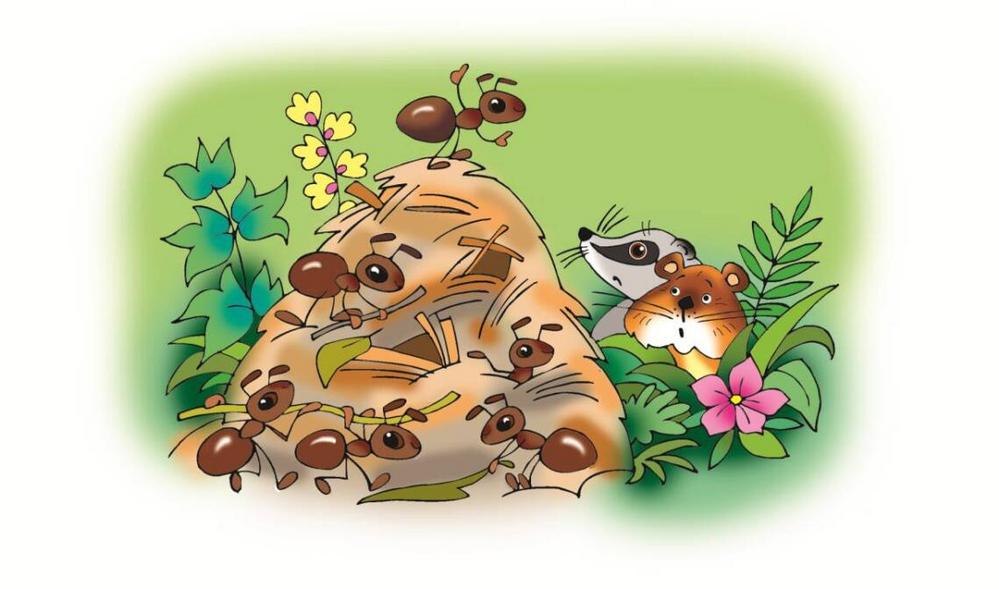 Глядят Барсук и Хомячок, сидя у своих неглубоко раскопанных норок, как дело быст-ро завершается у муравьёв, дом-муравейник, почти готов.