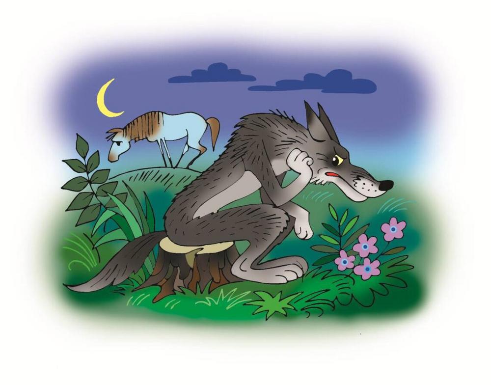 Глядит, стоит у стога сена старая Кляча. Подходит к ней Волк и спрашивает, как ему быть?