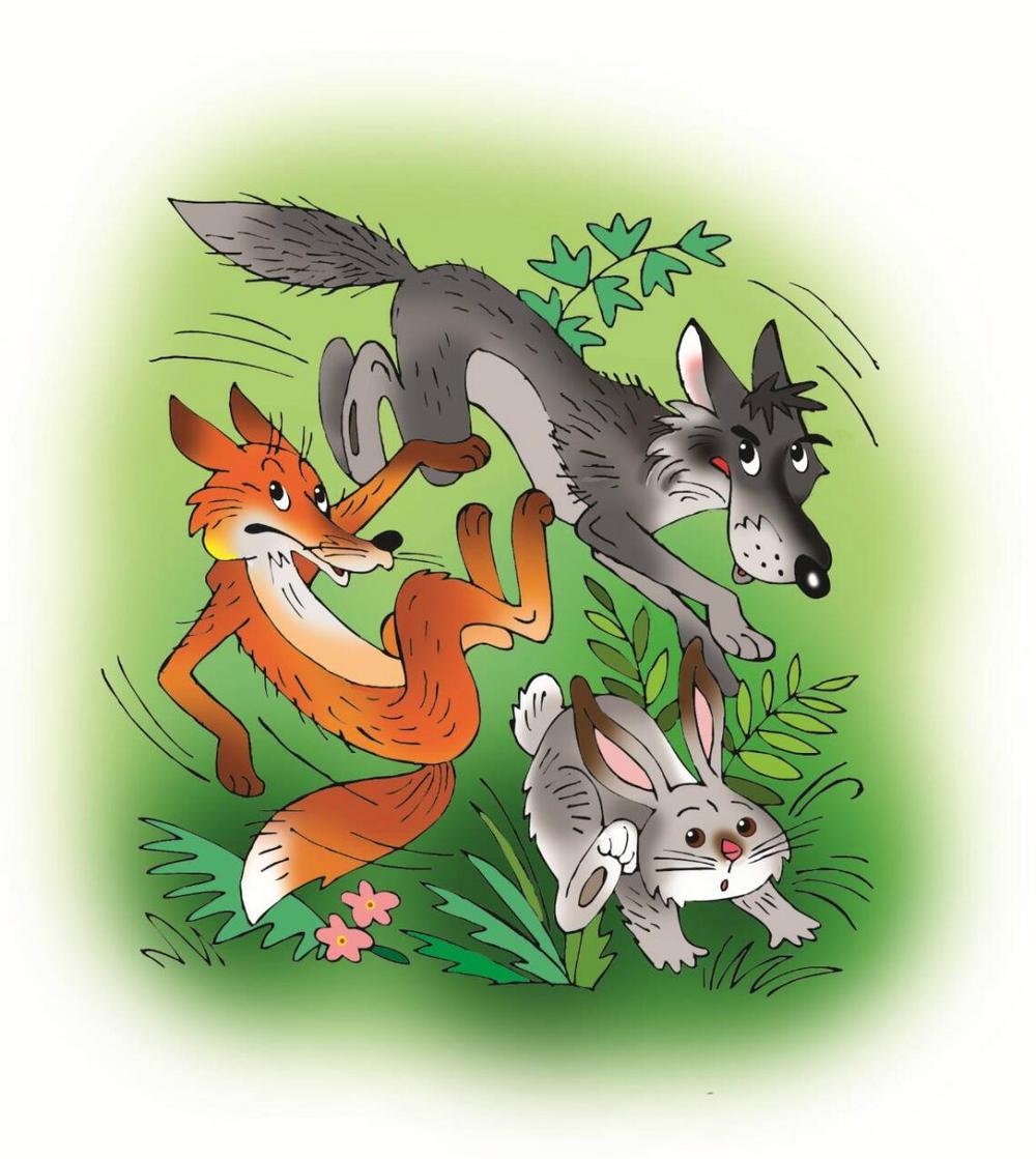 Промахнулся Волк, прыгая на Зайца, да сбил с ног Лису, что за Зайцем гналась.