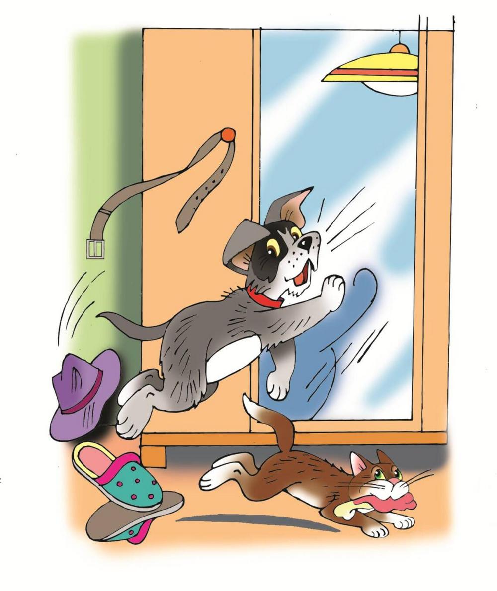 Бросила она на пол свою косточку и на-бросилась на зеркало, а когда поняла, что это было лишь отражение, то возвратилась в комнату и увидела Кошку, обгладывающую косточку.