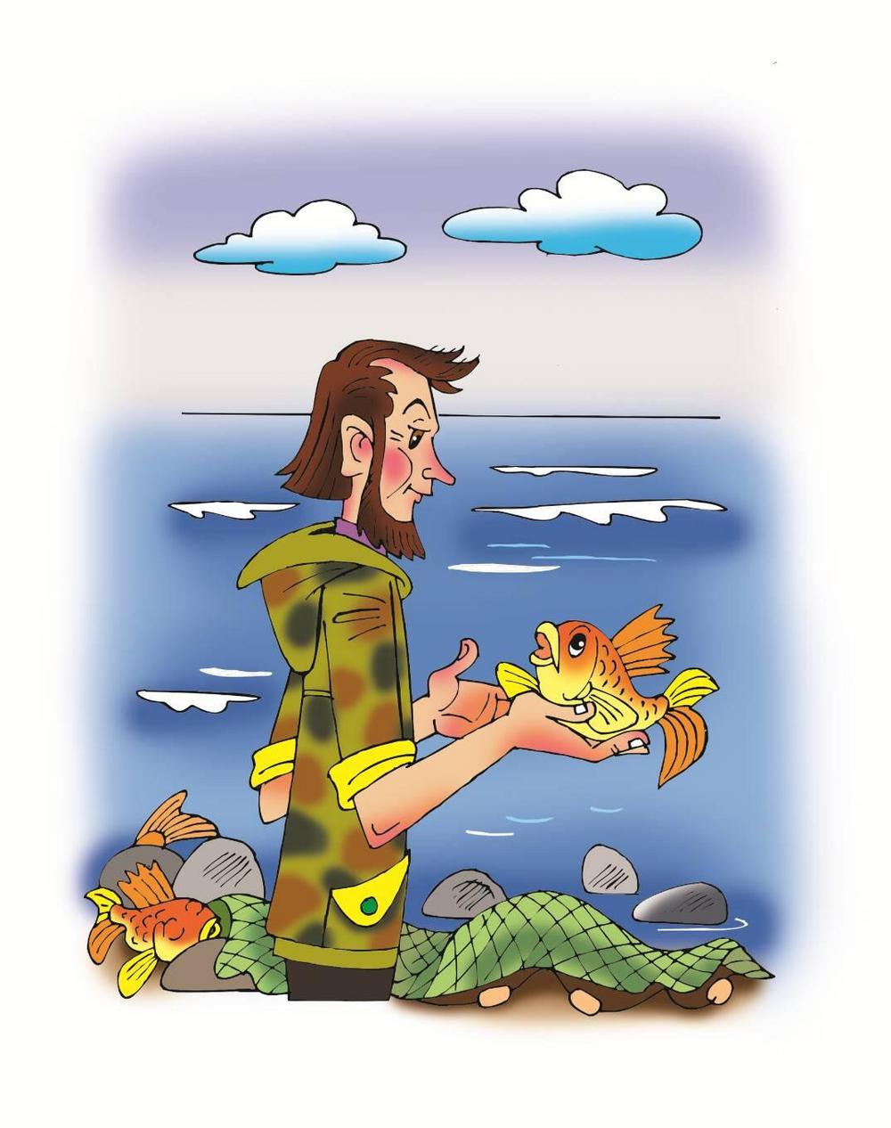Однажды на берег пришёл рыбак, забросил сеть и поймал умную Золотую Рыбку.