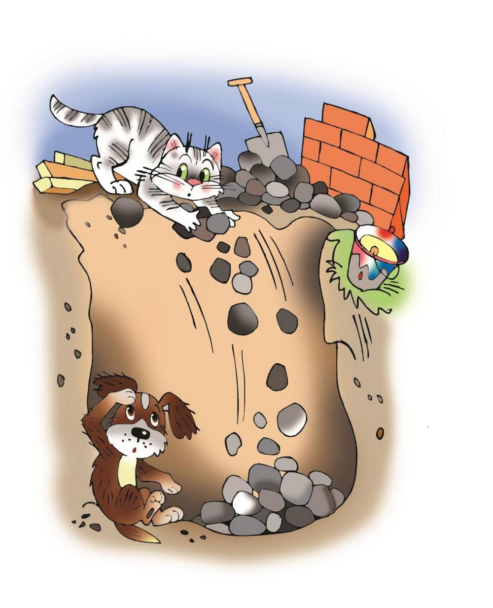 Однажды прогуливались возле стройки Собака и Кошка, и вдруг неожиданно оступи-лась Собака и угодила в глубокую яму.