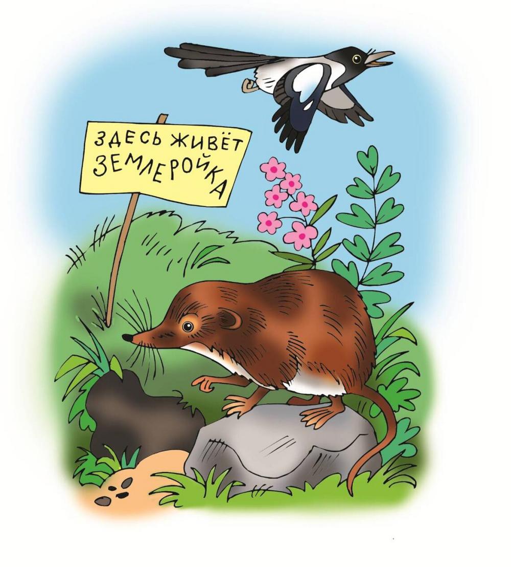 Однажды после сытого обеда прилегла Землеройка вздремнуть, и вдруг услышала, как шумные Сороки приземлились у её норки и стали спрашивать друг друга: «Кто здесь живёт?» Рассердилась Землеройка, выскочила наружу и повесила табличку: «Здесь живёт Землеройка!»