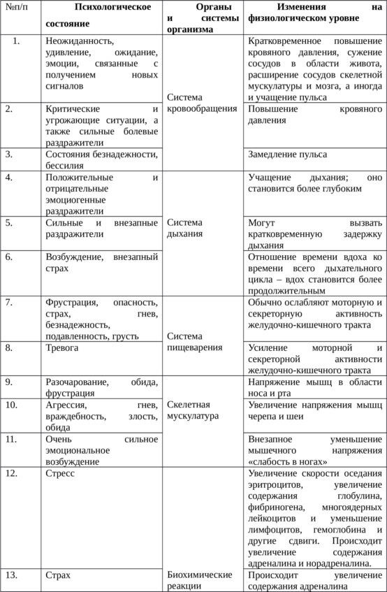 Тревога, страх, гнев, раздражение и другие негативные эмоции порождают реакции, как на психологическом, так и на физиологическом уровне организма: прерывистое дыхание, общее напряжение мышц и др. в этот же период меняется химический состав крови, желудочного сока, изменяется работа всех органов человека (см. таблица). Совокупность названных явлений называется реакцией мобилизации организма. Ситуация характеризуется дополнительным привлечением внутренних ресурсов, потенциал которых не является беспредельным и со временем они начинают угасать.