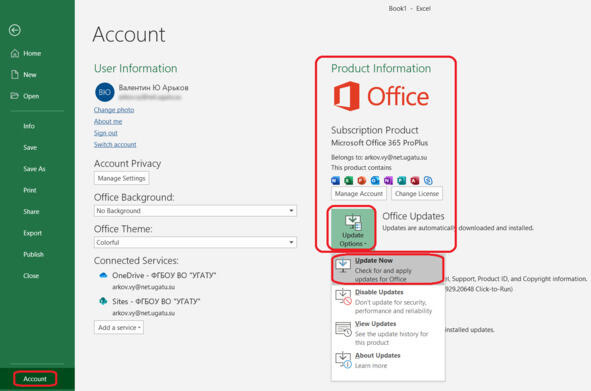 File Account Product Information Office Updates Update Options Update Now (рис. 1.5).