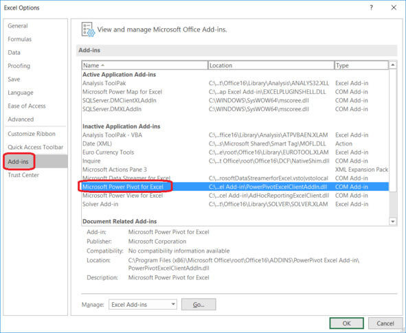 В разделе неактивных надстроек находим Microsoft Power Pivot for Excel: