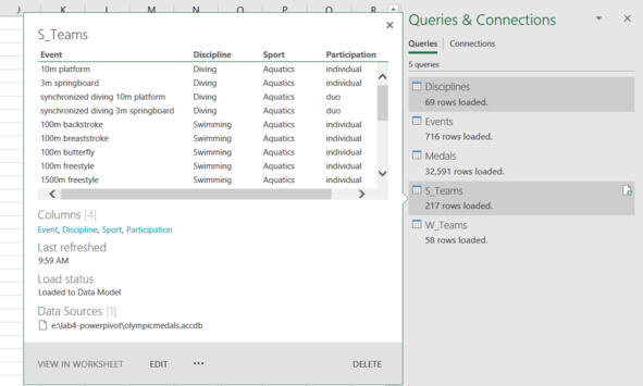 Кроме того, здесь говорится, что данные из выбранной таблицы были загружены в «Модель данных»: