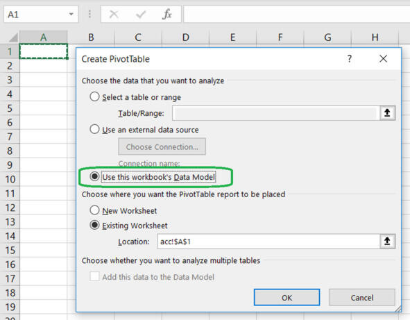 В качестве источника данных нам сразу предлагают использовать модель данных, которая уже создана в текущей рабочей книге: