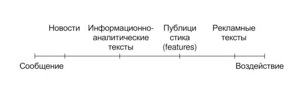 В данной главе речь пойдёт о лингвомедийных свойствах этих четырёх типов медиатекстов, которые будут рассматриваться в единстве своих языковых и медийных признаков, в последовательности, обусловленной их расположением на условной шкале реализации функций «сообщение воздействие»: