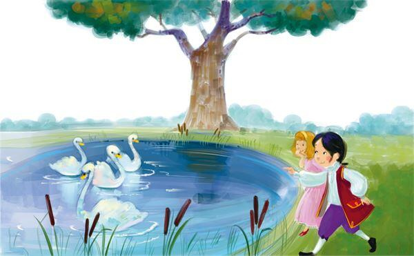 В сад прибежали маленькие дети, они стали бросать лебедям зёрна и хлебные крошки, а самый младший закричал: