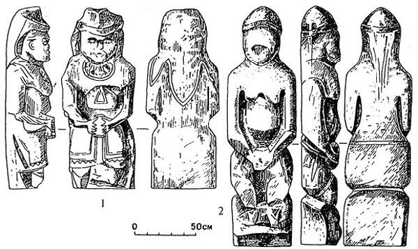 Половецкие каменные изваяния: 1 статуя женщины; 2 статуя мужчины