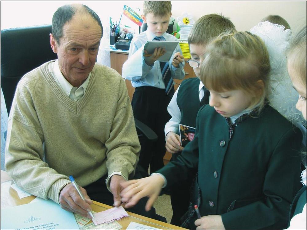 На встречу с нами поэт пришёл не один. С ним вместе был его внук, ученик 4-го класса Даниил Зайцев, который самостоятельно подготовил презентацию о биографии деда, о вехах его творческого пути, об их совместных делах и увлечениях. Выступление получилось очень трогательным, и присутствующие на встрече взрослые даже не пытались сдерживать набежавшие слёзы.