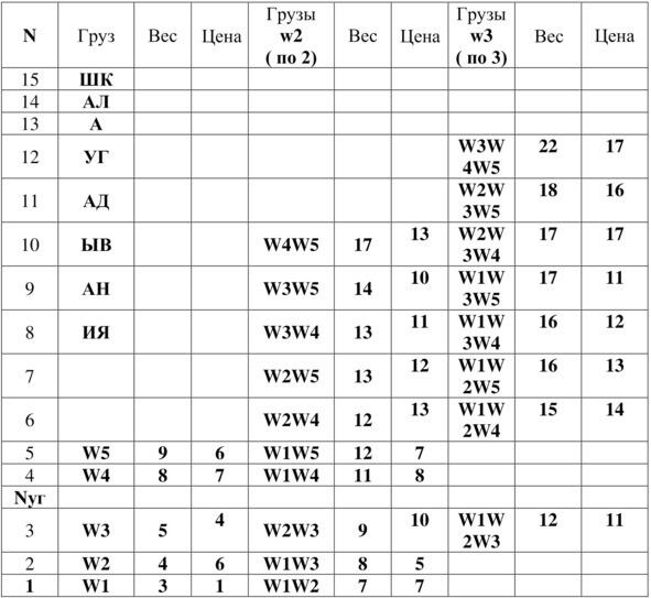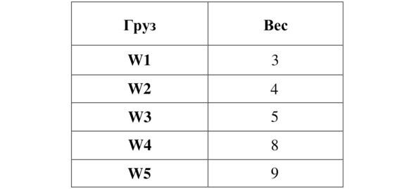 Для задачи о ранце определим, что ранец имеет грузоподъёмность W = 12. Количество грузов n = 5. Значения весов грузов W зададим в виде таблицы 3.