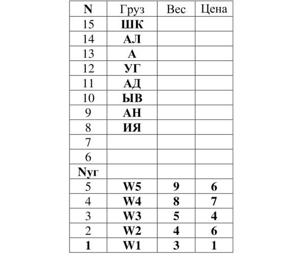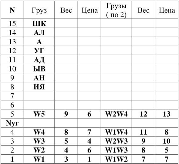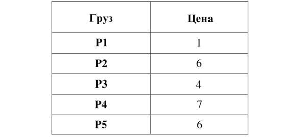 Занесём определённый упорядоченный вектор грузов относительно значений весов грузов и их цены в таблицу 5.