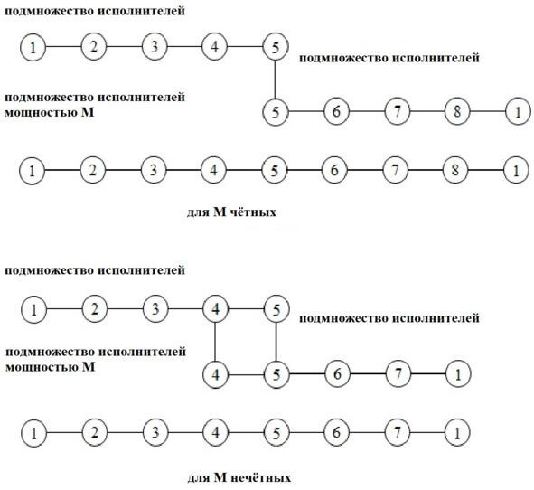 Данная процедура объединения подмножеств исполнителей меньшей мощности в подмножества исполнителей большей мощности, по различным правилам, должна повторятся до получения подмножеств исполнителей с числом исполнителей m = (М+1) /2 для М нечётных и с числом исполнителей m = M/2+1 для M чётных (пример объединения исполнителей в подмножество показан на рис.4.17.), где М является мощностью множества исполнителей.