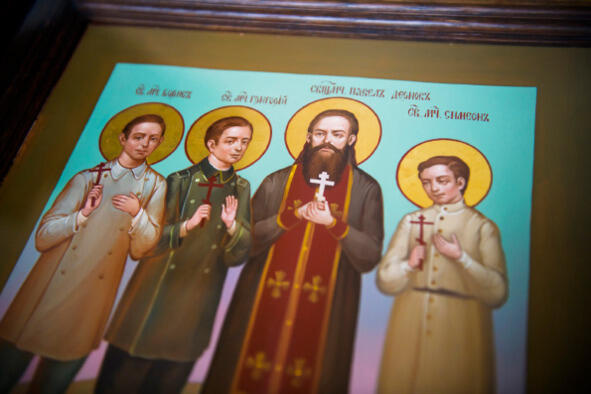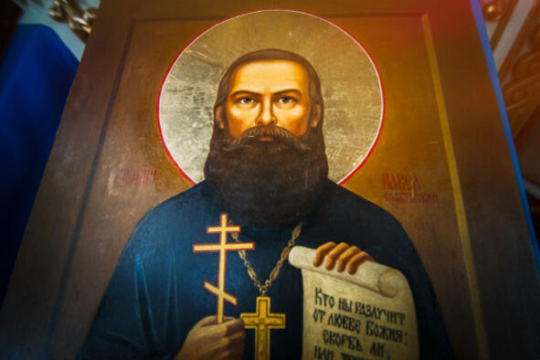 Величаем тя,/ священномучениче Павле,/ и чтим честная страдания твоя,/ яже за Христа/ во утверждение на Руси Православия// претерпел еси.