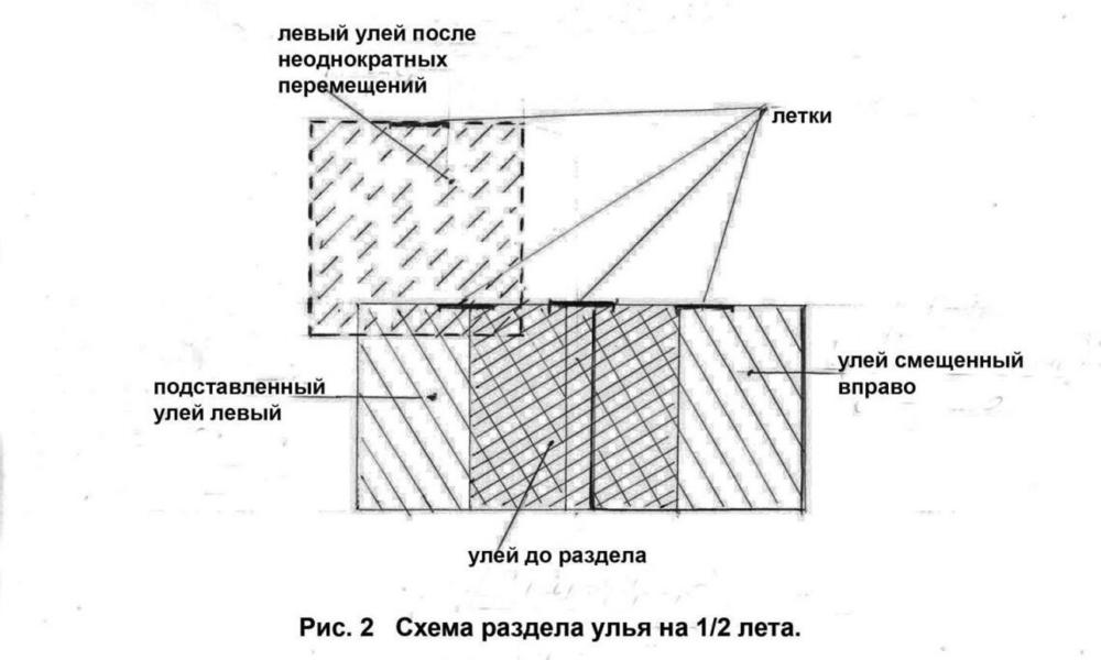 Это описано хорошо в литературе. Я это делаю так. Делимый улей сдвигаю на 30-40 см влево. Рядом с ним справа подставляю пустой улей. Когда пчела хорошо пойдет работать, делю весь расплод и молодую не летную пчелу. При этом нужно натрусить молодой пчелы в подставленный улей больше. И больше переставить в него выходного расплода. Не печатный расплод оставить в родном улье. Матку переношу в бывший пустой улей. Полученные таким путем пчелосемьи можно усилить молодой пчелой и выходным расплодом из других ульев. Кормами тоже обеспечить. На другой день ульи немного поворачиваю по оси, чтобы летки повернуть градусов на 45. В последующие дни начинаю ульи понемногу отодвигать друг от друга. И левый немного выдвигаю вперед. Так, чтобы в конечном счете получилась картинка. См. рис. 2.