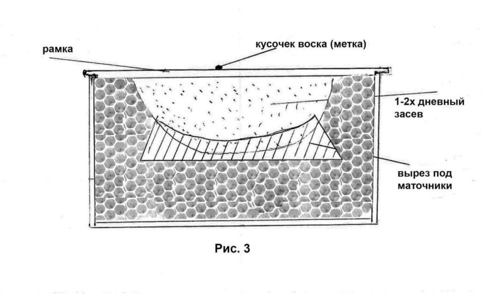 У нас в улье без матки стоит меченая воском рамка в центре. Ее нужно подрезать ножом, в центре рамки под самый засев. См. рис. 3.