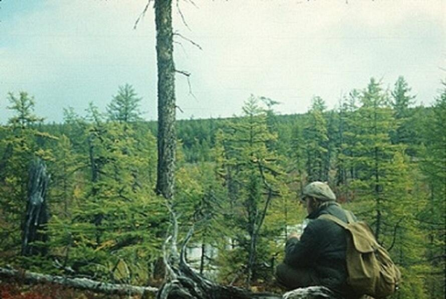 Векшин проходит выше по течению и за поворотом замечает крупное обнажение. Разрывая черно-зеленый занавес тайги, оно широким скалистым выступом нависает над рекой. Он взбирается к нему и видит широкую сильно перемятую складку с круто падающими темными прослоями.