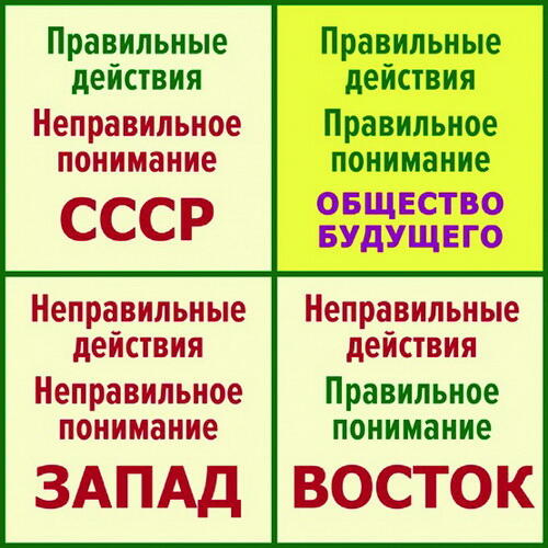 К настоящему моменту Восток, Запад и Россия уже перепробовали все способы неправильной жизни. Теперь пришло время всем нам научиться действовать правильно, с правильным пониманием жизни. Восток, Юг, Запад и Россия должны объединиться все вместе в единственно правильном четвёртом сегменте квадранта действий и нравственности. Человечество должно стать единым.