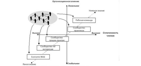 Доброго вам времени! С большим удовольствием хотел бы представить вашему вниманию свое сообщение. Сочетание слов «внутрикорпоративные сообщества» родилось не так давно. В начале 2000 годов компания «Ernst&Young» предложила свое понимание различных объединений в компании (групп, сообществ, сетей), основанное на том, каким активом знаний эти группы располагают, как влияют на локальную деятельность и результат бизнеса (рисунок 1). Эта схема подробнее будет рассмотрена ниже.