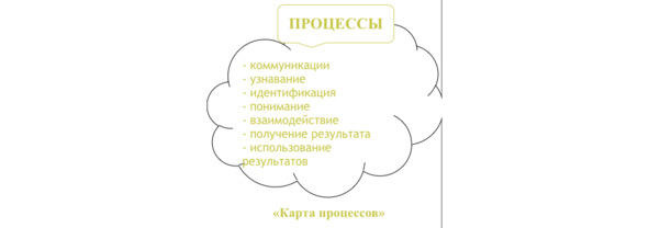 Четвертый объект это процессы. Процессы, ежедневно проживаемые человеком, который не только пришел на работу, а просто живет это день. Вы можете определить цикл, последовательность и название процессов в вашей компании. Мы предлагаем нашу последовательность, которая начинается с первичной коммуникации (у всех разной или с фирменного приветствия), процесса узнавания принятых норм и правил, способа идентификации свой/чужой и правильно/неправильно, приветствуется/не приветствуется Как, когда и где мы друг другу объясняем и обсуждаем нас интересующее? Каким образом и по каким правилам взаимодействуем? В рабочее или не рабочее время? Как получаем и используем результаты коллективных взаимодействий? Самое важное, что это не нужно придумывать! Нужно наблюдать и спрашивать, описывать и уточнять, создавать рисунок «Карту процессов».