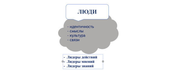 Первый объект это, конечно, люди. Мы выше говорили про важные элементы идентичности (отличий/совпадений), причем, добровольно выбранных и принимаемых. Смыслы и они же ценности (личные, коллективные и организационные), которые позволяют чувствовать и считать свою деятельность осмысленной и получать удовлетворение от ее результатов. Культурные коды (персональные, коллективные и организационные) и связи.