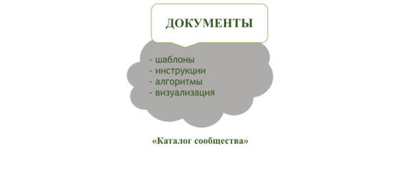 Второй объект это документы. Корпоративные шаблоны, формы инструкций самые часто используемые, сложные в написании, простые в применении документы. Структуры алгоритмов взаимодействий в сообществе от старта до результата с его описанием. Набор визуализаций, показывающих текущее состояние дел. Все эти документы могут быть представлены в «Каталоге внутрикорпоративных сообществ» и давать возможность быстро в этом разобраться и начать взаимодействовать.