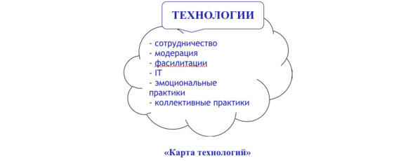 Третий объект технологии. Начинаем также с человеческих. Технологии сотрудничества это как в вашем организационном контексте можно использовать поддержку, помощь, практики выслушивания, практики структурной обратной связи, комплиментов и усилений мыслей, конструктивной критики и других коммуникационных практик. Практики коллективных модераций и фасилитаций. Информационные технологии, как инфраструктурные и поддерживающие. Практики управления эмоциональным состоянием и коллективных действий. Создав этот перечень, мы можем сформ ировать «Карту технологий» и объяснить почему именно эти.
