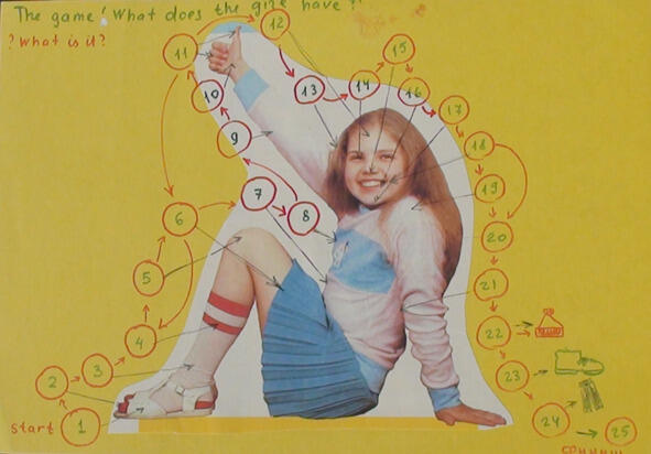 Учитель вместе с детьми делает такую игру. Он чертит сетку и подписывает названия животных, а дети вырезают и наклеивают картинки в клетки. Мы по очереди бросаем кубик, делаем шаги и записываем на листе бумаги то животное, на котором остановилась фишка (пуговица). Ребёнок повторяет счёт по-английски и названия животных. Мы шутим: