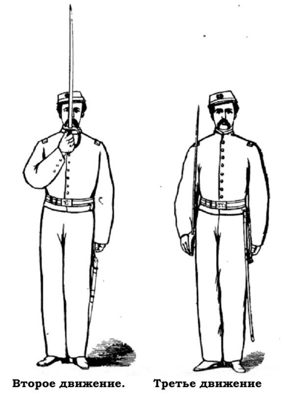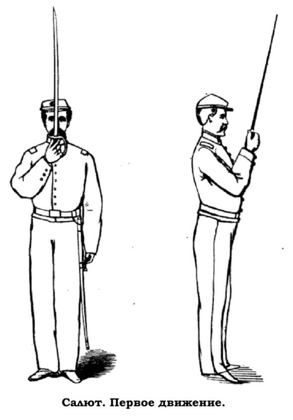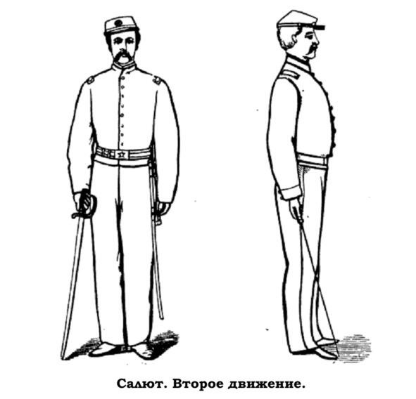 Второе движение: опустите руку в ее нормальное положение вдоль тела, саблю обухом положите в выемку плеча.