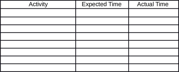 Estimate the amount of time that you think you spend on the various activities listed and enter these in the expected row of the summary sheet. Feel free to add any additional categories that might be helpful. Then log your time for one week on an hour by hour basis. When the week is over summarize your time by category for each day, add up the values for all seven days of the week, and write the totals in the actual row of the summary sheet.