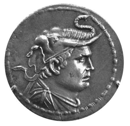 Позже именно такой головной убор в виде головы слона с поднятым хоботом хорошо был известен и в романском искусстве это так называемый proboscis, или exuviae elephantis. Его можно увидеть на монетах древнеримского военачальника и политического деятеля Метелла Сципиона. На сципионовых монетах кончик слоновьего хобота, изгибаясь, опускается вниз и орошает растение. Этот головной убор был своего рода символом Александрии, а затем и римской провинции Африка. Такие монеты чеканились в 4746 гг. до н. э.