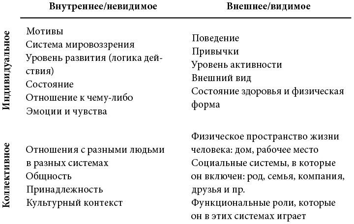 Принцип 2. Интегральность, целостность как основа устойчивых изменений. Необходимость в трансформационных измененияхЧеловек целостная система, включающая в себя как внутренние особенности (мотивы, потребности, особенности характера, различные эмоционально-мыслительно-телесные комплексы, сформированные в ходе развития личности; мировоззрение и прочее), так и внешние (физическая форма и внешний вид, поведение и прочее) (см. табл. 1.1).