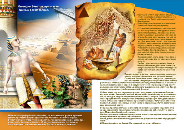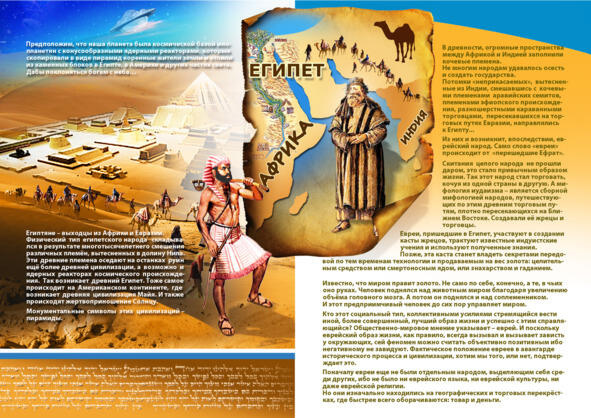 Египтяне выходцы из Африки и Азии, физический тип египтянина сложился в результате многотысячелетнего смешения различных племён, вытесненных в долину Нила. Эти древние племена оседают на останках руин ещё более древней цивилизации, а возможно и ядерных реакторах космического происхождения. Так возникает древний Египет. Тоже самое происходит на Американском континенте, где возникает древняя цивилизация Майя. И также происходят жертвоприношение Солнцу. Монументальные символы этих цивилизаций пирамиды.