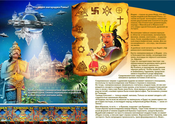 Индия страна на реке Инде, это наследие индийской Империи Рамы, останки которой поглощены непроходимыми джунглями или покоятся на дне океана. Как и Египетская цивилизация, наряду с Минойской и Микенской это следы одной большой, древней культуры. Возникшие тайные знания касты жрецов в области: астрономии, математики, физики, химии, анатомии и других наук, были зашифрованы в непонятные иероглифические знаки.