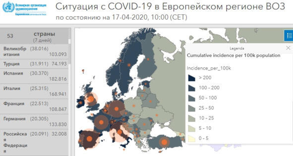 По состоянию на 10:00 CET 17 апреля 2020 года в мире зафиксировано 2 074 529 подтверждённых случая COVID-19, погибли 139 378 человек. Из них в Италии 168941 случай, 22172 погибших [5] (в т.ч. 131 медицинский работник [6]). Количество погибших в Италии превысило количество погибших в Китае. Ситуация в других странах (официально по ВОЗ на 16 апреля): Украина 4162 заболевших, 115 погибших; Россия 27938 заболевших, 232 погибших; Китай 83797 заболевших, 3352 погибших; Испания 177633 заболевших, 18579 погибших; Германия 130450 заболевших, 3569 погибших; Франция 105155 заболевших, 17146 погибших; Великобритания 98480 заболевших, 12868 погибших; Иран 76389 заболевших, 4777 погибших; США 604070 заболевших, 25871 погибших; Канада 27540 заболевших, 954 погибших. Пандемия распространилась на более чем 200 стран/территорий; потребовалось более трех месяцев, чтобы достичь первых 100 000 подтверждённых случаев, и всего 12 дней, чтобы достичь следующих 100 000.
