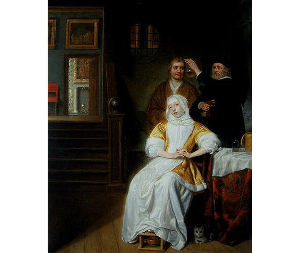 Весьма примечательная работа художника из славной когорты голландских живописцев середины XVII века. Излюбленная тема: несчастная девушка и доктор, ставящий неутешительный диагноз. Как правило, речь идёт о незапланированной, а то и просто непонятно как случившейся беременности.