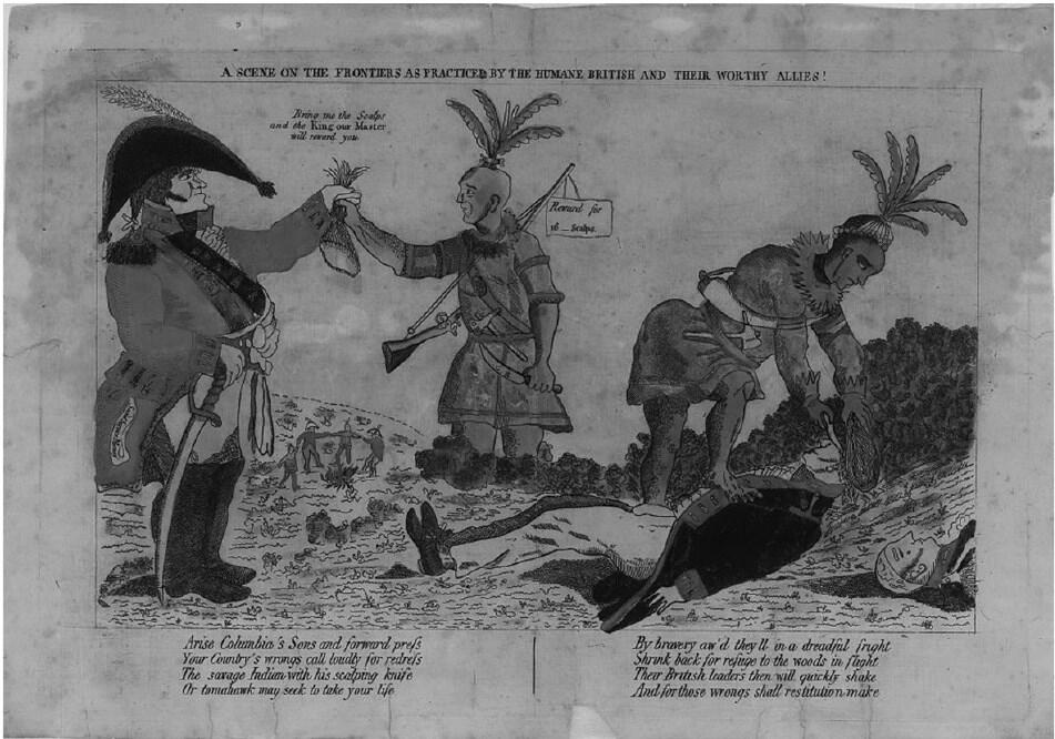 Для сплачивания общества перед лицом внешней угрозы необходим созданный пропагандистами «образ врага». Такого врага население западных штатов видело во враждебных индейцах. Американцы не без оснований были убеждены, что англичане всячески поддерживают индейского вождя Текумсе и помогают его сопротивлению американцам. Не случайно конгрессмен Феликс Грунди заявил: «потомки с гордостью будут праздновать день, когда Конгресс объявил о начале войны против Британии» Популярный карикатурист Уильям Чарльз отразил индейскую угрозу в красноречивой карикатуре «Сцена на фронтире, или гуманная практика британцев и их «достойных» союзников»69.