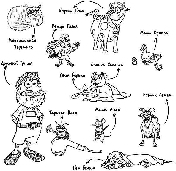 Заведовал всем этим хозяйством домовой Гриша. Раньше он отвечал только за порядок в доме, но с тех пор, как хозяйка отпраздновала своё девяностолетие, двор начал приходить в упадок. Старушка перестала окучивать огород и ухаживать за животными. Всё своё время она щёлкала семечки, сидя на лавочке с ровесницами. Так Гриша стал отвечать за всё хозяйство. Ему помогали мышь Люся и таракан Вася.