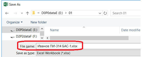 Надеюсь, читателям уже приходилось сохранять файлы. Здесь всё просто и знакомо кроме одной незначительнй детали. Нам нужно не просто дать КАКОЕ-НИБУДЬ название или не глядя согласиться с безликим Book1.xlsx или Книга1.xlsx. Нужно выбрать КОРОТКОЕ ИНФОРМАТИВНОЕ название.
