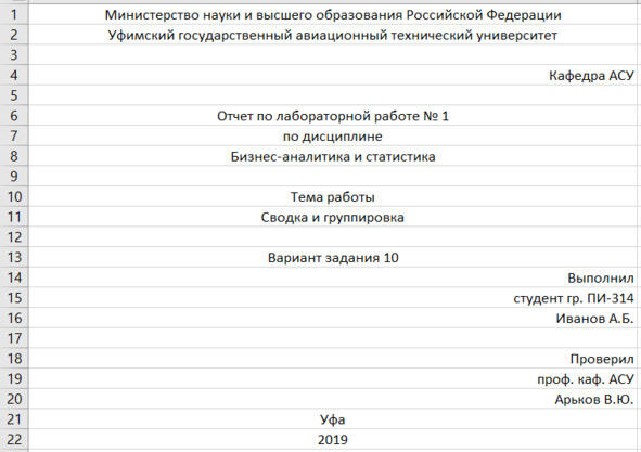 Отчёт содержит текст, графики, рисунки, таблицы, формулы, ссылки и т. п. Каждый элемент отчёта должен сопровождаться кратким пояснением. Например, если группировка данных проведена с помощью статистической надстройки «Анализ данных», то будет достаточно указать: «Группировка. Надстройка».