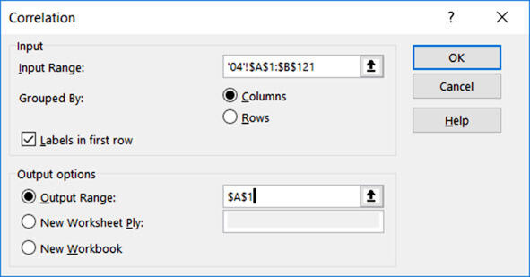 Выделяем значения в столбцах X и Y вместе с их заголовками. В этом случае в таблице с результатами анализа будут выводиться названия переменных.