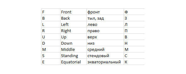 Вращение среднего слоя S. Этот слой находится между передней F и задней B гранями. Направление вращения слоя S совпадает с направлением вращения грани F. Вращение среднего слоя E. Этот слой находится между нижней D и верхней U гранями. Направление вращения слоя совпадаем с направлением вращения грани D. Это означает, что направление по часовой и против часовой стрелке совпадает с направлением соответствующей грани. Всё понятно, но как это запомнить?