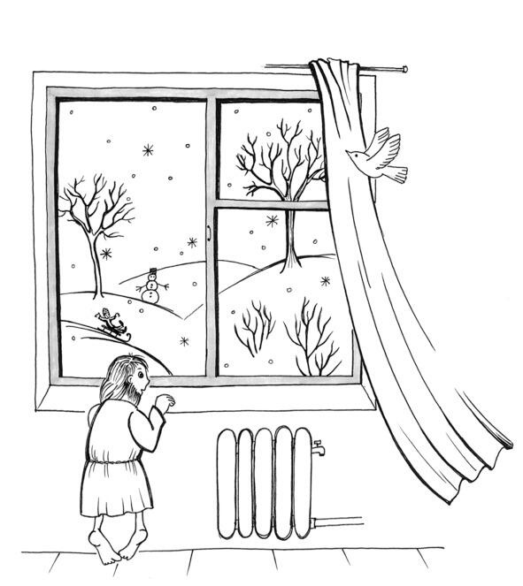 Так вот, не успела Зинька залететь, как тут же начала рассказывать, где она была и что видела. Оказывается, осень закончилась. Листья с деревьев все облетели. Дети ходят в тёплых куртках и капюшонах, в варежках и тёплых сапожках, в тёплых шапочках. С неба уже капает не дождь, а падают белые пушистые снежинки, и скоро вся земля укроется белым пушистым покрывалом.