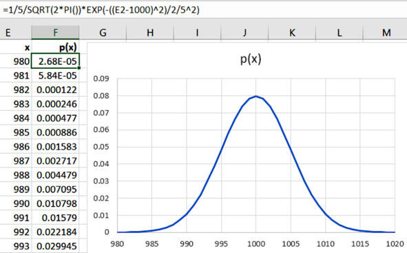 Построим график нормального распределения для своего варианта по формуле (4.1). Для этого создадим столбец в несколько десятков чисел в пределах «среднее плюс-минус три сигмы». Для нулевого варианта возьмём числа от 980 до 1020 с шагом 1. Вставим график на той же странице отчёта, где находится зарисовка для нашего варианта (рис. 4.3). Используем «точечный график», в котором задают массив «иксов» и массив «игреков»: