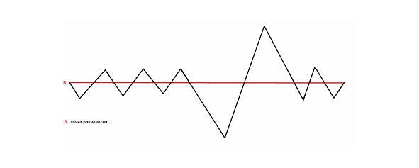 На рынках ценных бумаг эта модель выглядит следующим образом: Между Быками и Медведями, которые в своей ежедневной торговой практике используют только какие-то статистические данные и не учитывают закон вибрации, распределение вероятности получения прибыли и убытков равна примерно 50/50. Уровень в 50/50 это точка равновесия, от которой происходит колебание вероятности то в лучшую сторону, то в худшую по отношению к успешной торговле, с большим склонением к худшей из за сильной конкуренции масс торговцев ценными бумагами между собой.