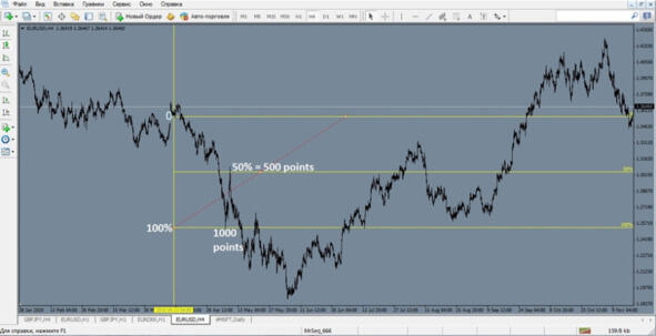 Метод исследования был таков, по закону вибрации, где бы мы не вошли в рынок, с этого момента куда бы не пошел курс ценной бумаги, он в последствии вернется обратно и отработает свои 50%.