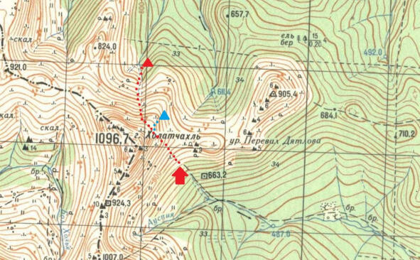 Вот три маршрута, которыми можно пройти с перевала к Отортену. По какому из них планировали идти ребята? Я думаю, что они не стали ничего выдумывать, и собирались идти к Отортену по основному зимнему маршруту, т. е. границей леса. Тем не менее, один вопрос всё равно остаётся. А именно: как группа хотела пройти северо-восточный отрог Холатчахля? Как видно из карты, его можно обойти низом (более длинный путь), а можно и перевалить через него. Я думаю, что ребята с самого начала выбрали второй, более короткий путь. На это, в частности, указывает место установки ими 1 февраля палатки, которую через месяц обнаружили поисковики. Недалеко от вершины северо-восточный отрог Холатчахля имеет седловинку вот в этом месте ребята и хотели через него перевалить. Ввиду позднего выхода со стоянки на Ауспии переход 1 февраля однозначно планировался коротким. Времени хватало только на то, чтобы подняться на перевал, пройти северо-восточный отрог, по его западному склону спуститься в зону леса в долине Лозьвы и здесь встать на ночёвку. Но не получилось.
